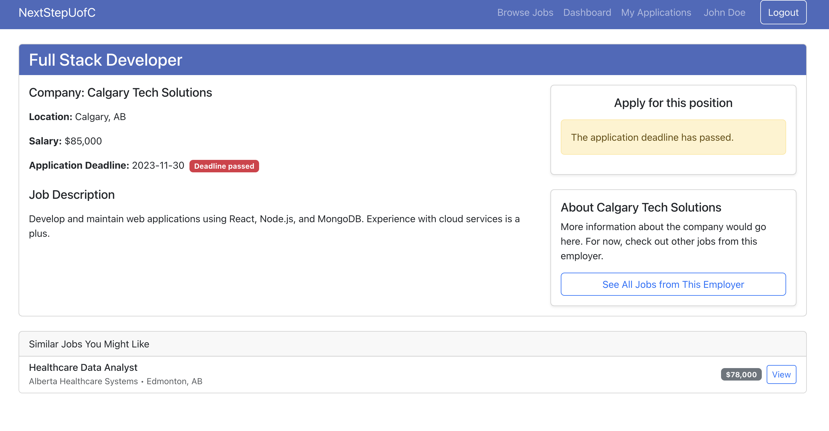 A tailored platform for University of Calgary students to connect with employers. Features include student/employer dashboards, job posting, application tracking, and moderator approval flow.